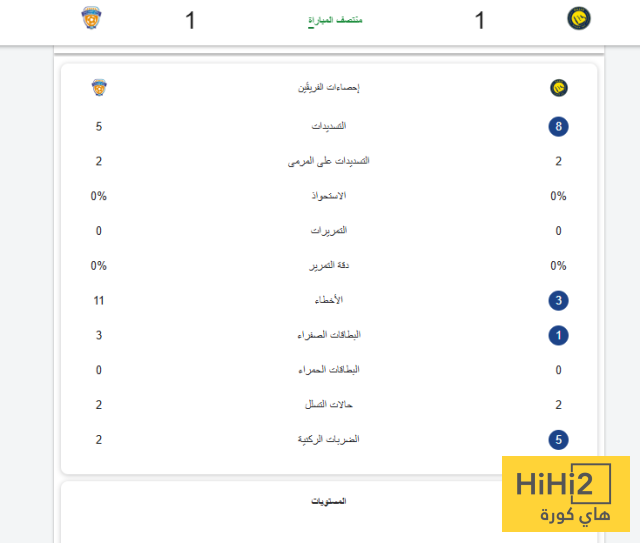هاي كورة : تفوق نادي النصر في إحصائيات الشوط الأول أمام الفيحاء، بعدما انتهى بالتعادل الإيجابي (1-1) ضمن منافسات دوري روشن السعودي للمحترفين، على ملعب الأول بارك، وسجل للعالمي رونالدو بينما للمنافس جيسون.