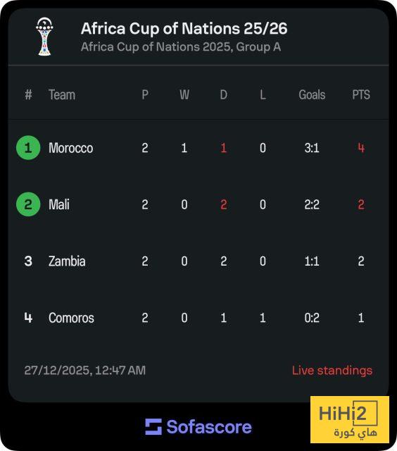 جدول ترتيب مجموعة المغرب بعد التعثر أمام مالي