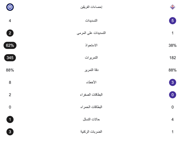 إحصائيات ساعة من مباراة إنتر ميلان وفيورنتينا في الدوري الإيطالي