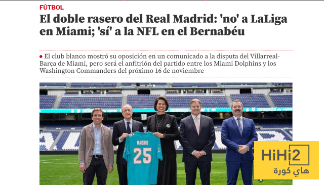 وفي المقابل، في 16 نوفمبر المقبل، سيستضيف ملعب سانتياغو بيرنابيو مباراة في كرة القدم الأمريكية بين ميامي دولفينز وواشنطن كومانديرز، دون أن يبدي النادي أي تحفظات على “نزاهة المنافسة”، مفضلًا الأرباح المالية.