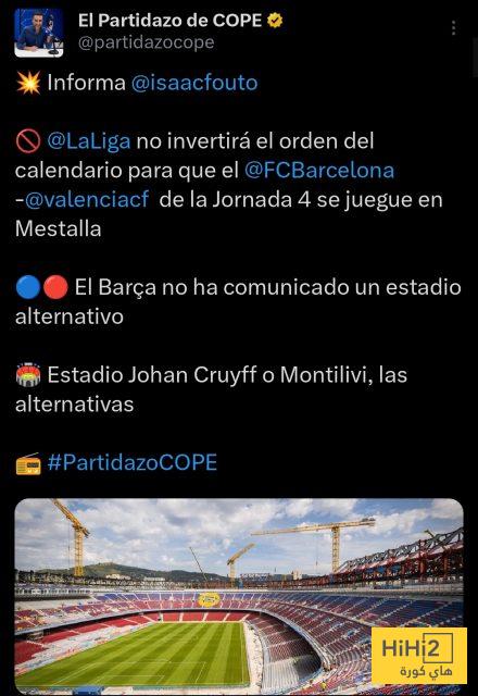 وحتى اللحظة، لم يحدد برشلونة ملعبًا بديلاً، لكن الخيارات المطروحة تشمل ملعب يوهان كرويف أو ملعب مونتيليفي.