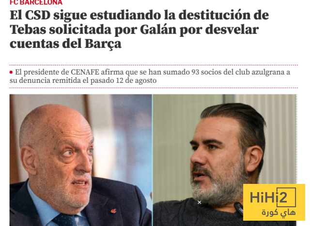 هاي كورة- أكدت صحيفة موندو ديبورتيفو الاسبانية أن المجلس الاعلى للرياضية يواصل دراسة طرد خافيير تيباس من منصب رئيس رابطة الدوري الاسباني بناءا على طلب ميغيل غالان و93 عضوا من فريق برشلونة بسبب كشفه عن حسابات النادي الكتالوني من خلال منشور رسمي على وسائل التواصل الاجتماعي.