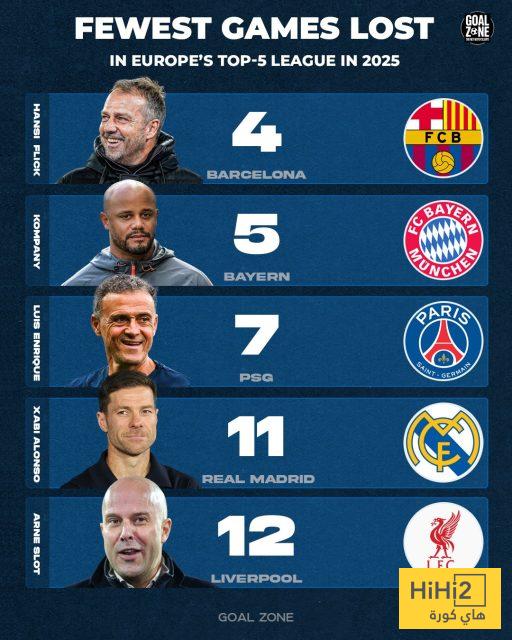 أما ريال مدريد فقد تراجع إلى المرتبة الرابعة بـ11 هزيمة، يليه ليفربول في المركز الخامس برصيد 12 خسارة، ما يبرز تفوق برشلونة على منافسيه من حيث الصلابة والاستمرارية.