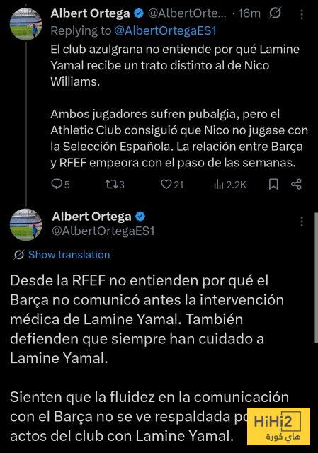 ” لا يفهم برشلونة سبب معاملة لامين يامال بشكل مختلف عن نيكو ويليامز . يعاني كلا اللاعبين من ألم في العانة ، لكن نادي أتلتيك بيلباو نجح في منع نيكو من اللعب مع المنتخب الإسباني … حاليًا ، تتدهور العلاقة بين برشلونة والاتحاد الإسباني لكرة القدم أسبوعًا بعد آخر “.