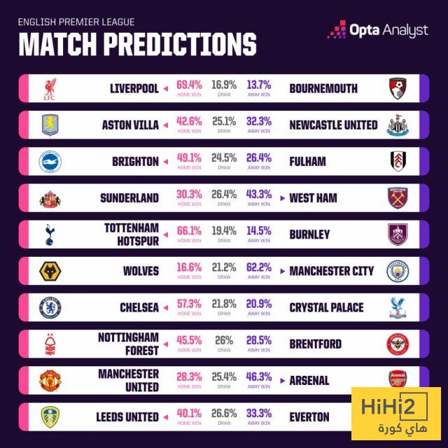 هاي كورة- كشفت توقعات شبكة اوبتا عن نتائج مباريات الجولة الاولى من الدوري الانجليزي الممتاز في موسمه الجديد 2025-2026 الذي تنطلق منافساته سهرة اليوم الجمعة .