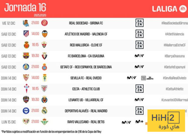 هاي كورة – أعلنت رابطة الدوري الاسباني ، مساء اليوم الاربعاء، عن موعد مباريات الجولة الـ 16 في الليغا لموسم 2025-2026 .