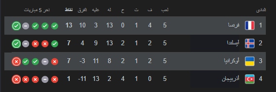 منتخب فرنسا في صدارة المجموعة الثالثة الاوروبية والتي تضم اوكرانيا وايسلندا واذربيجان حيث حقق الديوك 10 نقاط مما سمح له بالتأهل المباشر الى نهائيات كأس العالم دون الحاجة الى ملحق .