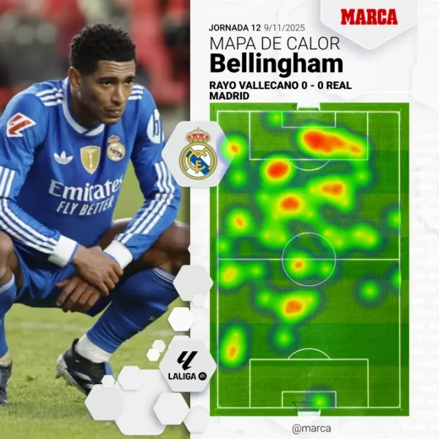 تفاقم هذا التحول بفعل عوامل أخرى . فبدون تشواميني المصاب ، ومع لعب فالفيردي كظهير ، فقد خط الوسط هيمنته . أما بيلينغهام ، فقد تقدم للأمام أكثر . وتوضح خريطته الحرارية هذا الأمر . ففي مواجهة خيتافي ، كان لا يزال يتراجع إلى العمق لدعم الهجوم ؛ وفي فاليكاس ، بالكاد لمس تلك المنطقة . وقد منحه دوره الجديد حضورًا أكبر في تسجيل الأهداف ، ولكنه ترك مدريد أيضًا بدون قدراته في صناعة اللعب . وفي هذا الفراغ ، يعاني اتصال آخر : اتصال غولر ومبابي ، اللذين، في هذا السيناريو، يحتاجان الفريق إلى التقدم عبر الوسط