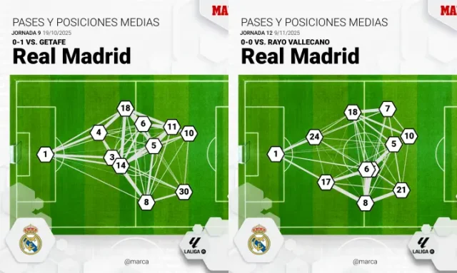 وتكشف أنماط التمرير عن تحول أعمق . في خيتافي ، كان هيكل الفريق متماسكًا ، مع وجود مثلث واضح بين لاعبي خط الوسط المدافعين وبيلينغهام ، القادر على ربط خط الوسط . مع ذلك ، في فاليكاس ، اتسع نطاق التشكيل . تداخل كامافينجا وغولر، وأصبح بيلينغهام أكثر عزلة . انتقلت مسارات التمرير إلى الأجنحة . في مواجهة صعوبة التقدم عبر خط الوسط ، أصبح الظهيران – فالفيردي وكاريراس – المبادرين الجدد . انحل اللعب المركزي إلى شبكة أوسع ، وإن كانت أكثر هشاشة .