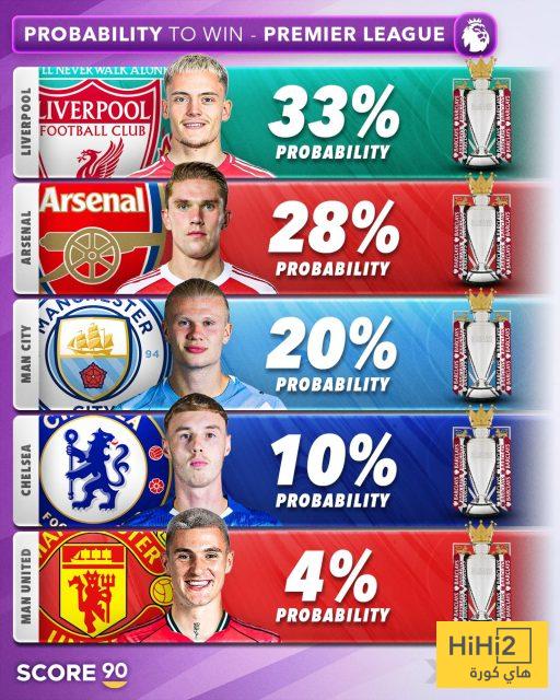هاي كورة: بحسب موقع score 90، ووفقًا لتوقعات شركات المراهنات، جاءت احتمالات الفوز بلقب الدوري الإنجليزي الممتاز على النحو التالي: