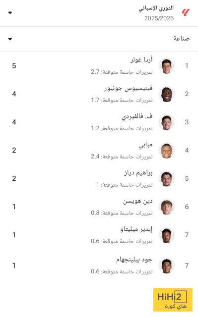 هاي كورة – يتصدر أردا غولر قائمة أكثر لاعبي ريال مدريد صناعة للأهداف في بطولة الدوري الإسباني هذا الموسم ، حيث قدم 5 تمريرات حاسمة ، وذلك قبل مواجهة رايو فاليكانو اليوم الأحد ضمن منافسات الجولة الثانية عشرة .