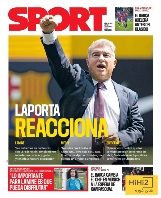 هاي كورة- عنوان الصفحة الاولى لصحيفة سبورت الكتالونية اليوم الخميس 13 نوفمبر 2025 هو ” لابورتا يرد ” ، فتناول رئيس برشلونة قضايا مختلفة تتعلق بالنادي على رأسها الصراع مع الاتحاد الاسباني بسبب لامين .