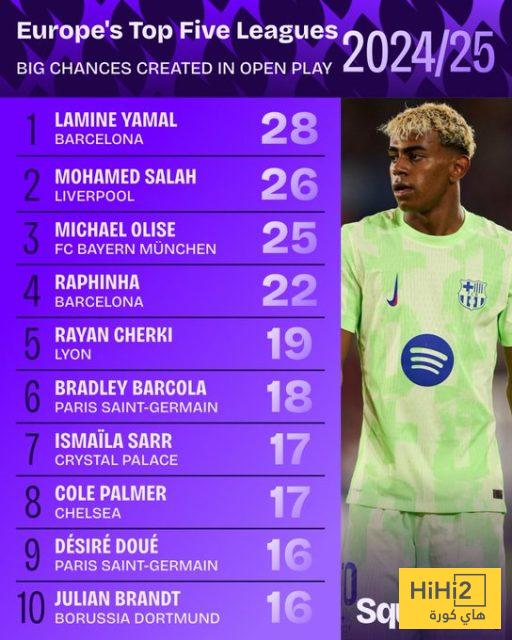 هاي كورة – نشر حساب Squawka إحصائية لأكثر لاعبي الدوريات الكبرى صناعة للفرص الكبيرة الموسم الماضي حيث تصدر لامين يامال، نجم برشلونة بـ 28 فرصة.