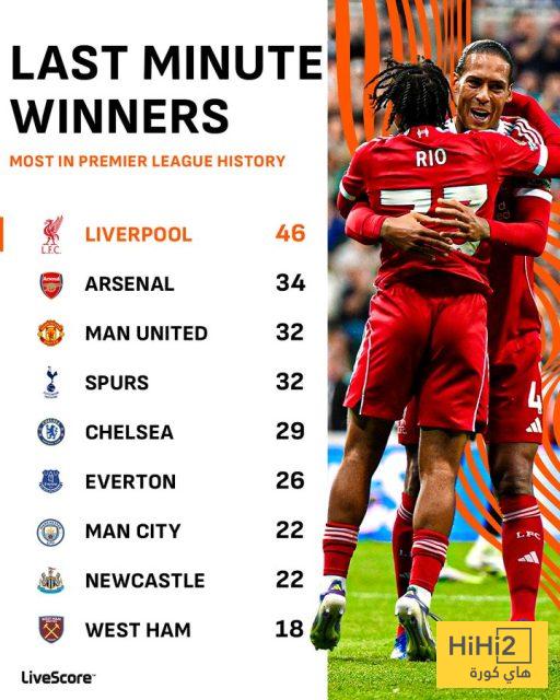 ويبدو وأن بطل البريميرليغ معتاد على ذلك، حيث أكد موقع لايف سكور أن ليفربول أكثر فريق حقق الفوز بالدقائق الأخيرة في تاريخ الدوري الإنجليزي بواقع 46 مرة، وبفارق كبير عن أقرب ملاحقيه أرسنال صاحب الـ34 مرة.