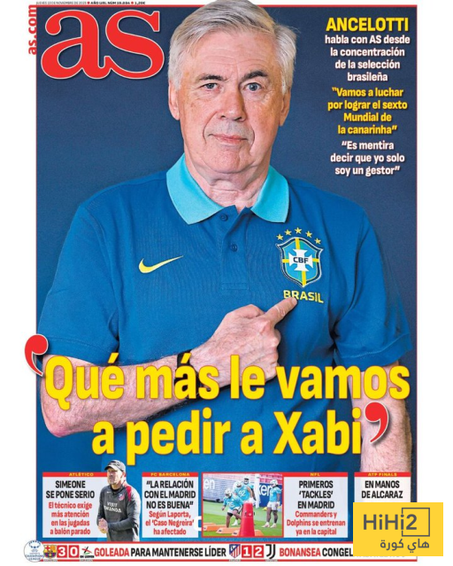 هاي كورة- تصريحات كارلو أنشيلوتي مدرب منتخب البرازيل حاليا والمدير الفني السابق لفريق ريال مدريد تصدرت غلاف صحيفة أس الاسبانية اليوم الخميس 13 نوفمبر 2025 .