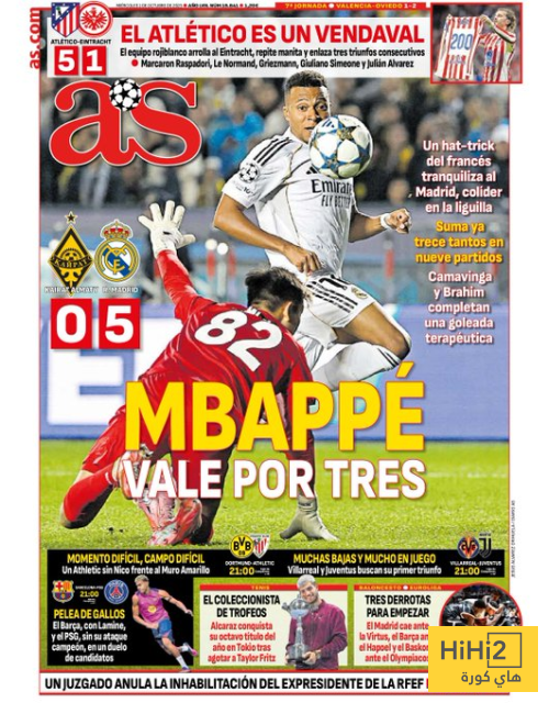 هاي كورة- تصدر كيليان مبابي غلاف صحيفة أس الاسبانية بعد فوز ريال مدريد على كيرات الماتي بخماسية دون رد، مساء الثلاثاء ، في الجولة الثانية من مرحلة المجموعات ببطولة دوري ابطال اوروبا.