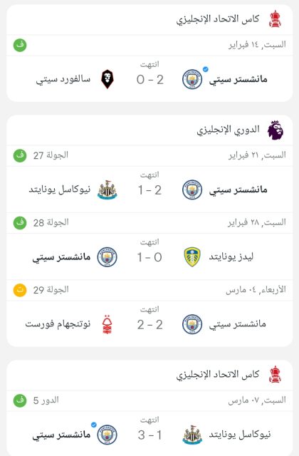 وجاءت نتائج مانشستر سيتي كالتالي :