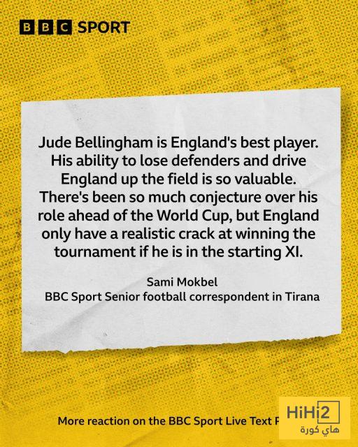 ” جود بيلينغهام هو أفضل لاعب في إنجلترا . قدرته على مراوغة المدافعين ودفع إنجلترا إلى الأمام في الملعب قيمة للغاية . كان هناك الكثير من الجدل حول دوره قبل كأس العالم ، لكن إنجلترا لن تملك فرصة حقيقية للفوز بالبطولة إلا إذا كان ضمن التشكيلة الأساسية .”
