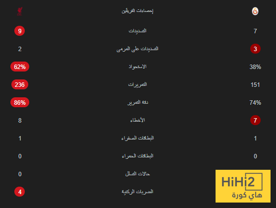 احصائيات الشوط الاول من مباراة ليفربول ضد غلطة سراي